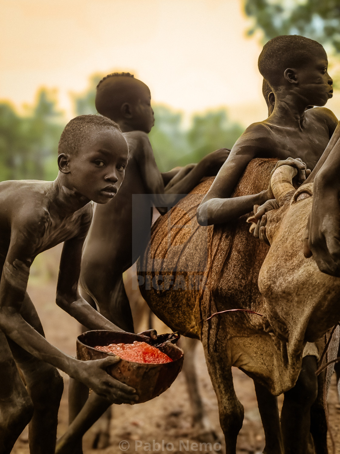 Taken during Pablo Nemo’s 800-day solo journey across Africa, this photograph captures a raw and sacred tradition among the Suri people of Ethiopia’s Omo Valley. After piercing the neck of a cow with bow and arrow, young boys collect the stream of warm blood in a carved wooden bowl — preparing to drink together in a ritual of endurance and identity. (2023) ©PabloNemo